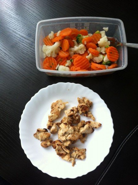 A szombati tokányhúsból ismét mentettem egy kis kupacot, amit hétfő reggel a kávéfőzés közben elkészítettem. Főztem hozzá egy zacskó fagyasztott zöldséget (400g brokkoli-répa-karfiol – 249 Ft). Ez lett a hétfői menü 350 Forintból (ismét arányosítva) 🙂